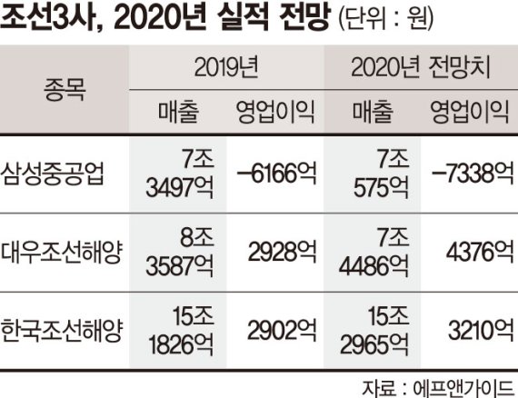 금융정보업체 에프앤가이드에 따르면 한국조선해양은 지난해 3210억원을 기록해 전년 보다 10.6% 증가할 것으로 예상되며, 대우조선해양은 4376억원을 달성해 전년대비 49.5% 늘어날 것으로 예상된다. 다만 삼성중공업은 영업이익 7338억원 적자가 예상되 전년 보다 적자 폭이 확대될 것으로 보인다. 지난해 수주 목표 달성률은 각각 현대중공업 91%, 삼성중공업 65%, 대우조선해양 75%였다.