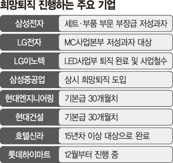 5일 본지 취재 결과 전자·자동차·중공업·건설·호텔면세·유통 등 거의 전 업종에서 주요 대기업들이 희망퇴직을 실시했거나 진행 중인 것으로 확인됐다. 본지가 파악한 기업만 삼성전자, LG전자, LG이노텍, 르노삼성, 삼성중공업, 현대엔지니어링, 현대건설, 호텔신라, 롯데하이마트 등 10여곳에 달한다.
