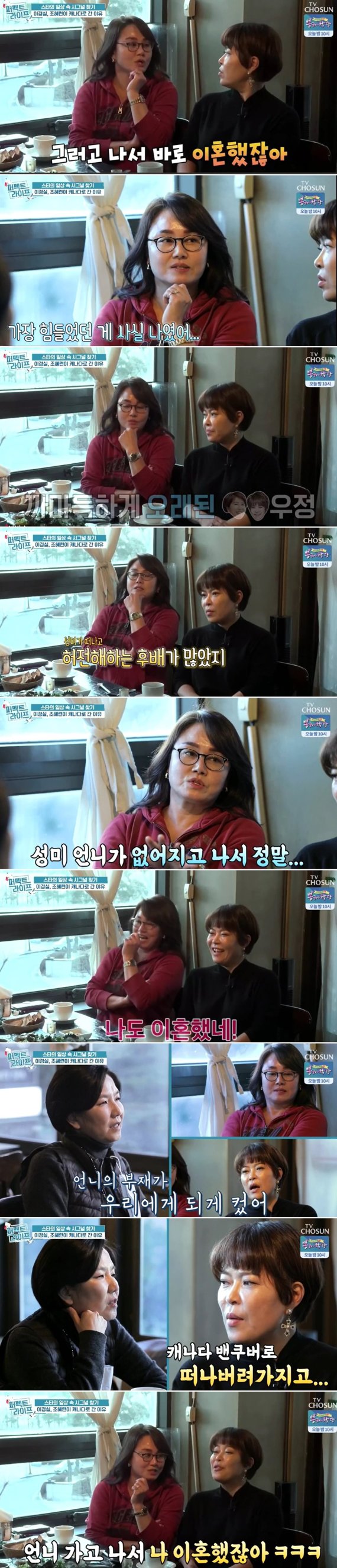 이에 맞장구 친 이경실은 "허전해하는 후배들이 많았다. 나같은 경우도 거의 성미 언니랑만 일했는데 언니가 떠난뒤 가장 힘든 게 나였다. 그러고 나서 바로 이혼했잖아"라고 가감없이 말했다. 그러자 조혜련은 "그러고보니 그러고 나서 나도 이혼했네"라고 말해 모두가 박장대소했다.