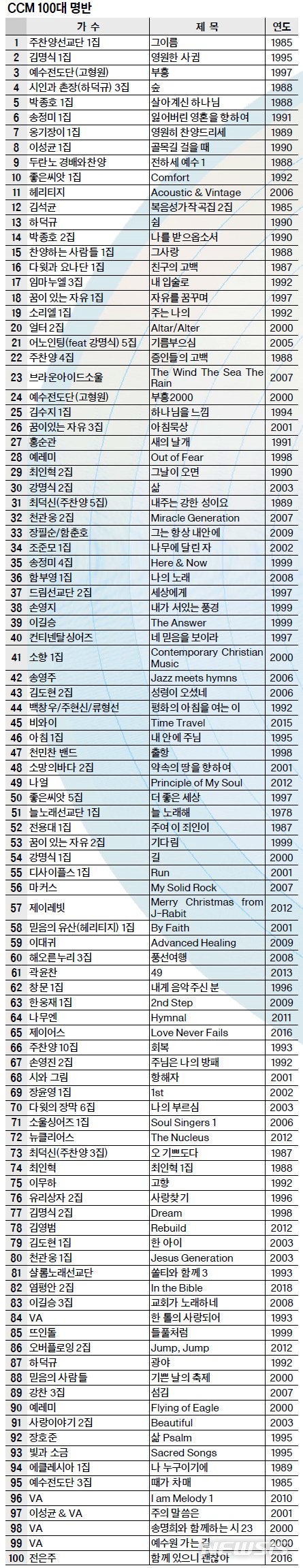 목록에는 1980년대 노래운동의 태동기 작품, 1990년대 CCM 황금기 음반, 2000년대 모던 워십과 실험적 작품 등이 고루 포함됐다.
