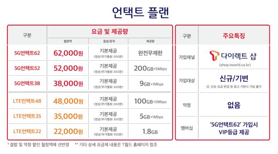 세부적으로 살펴보면 5G는 △월 6만2000원에 데이터를 완전 무제한으로 이용 가능한 ‘5G언택트62’ △월 5만2000원에 200GB 대용량 데이터를 제공하는 ‘5G언택트52’ △월 3만8000원에 5G서비스를 이용할 수 있는 ’5G언택트38’ 등 중∙저가 요금 3종이 신설됐다.