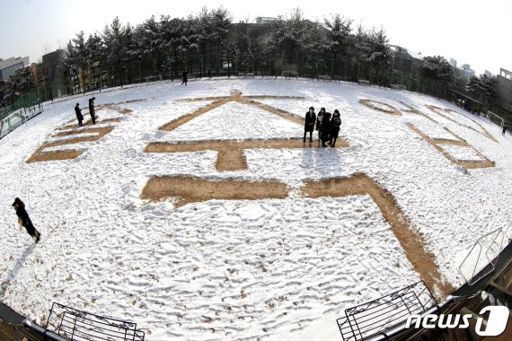 일부 학생들은 눈 덮힌 학교 모습을 카메라에 담느라 분주했다. 운동장에 눈으로 써놓은 졸업 축하 글귀도 신기한지 학생들이 모여들었다.