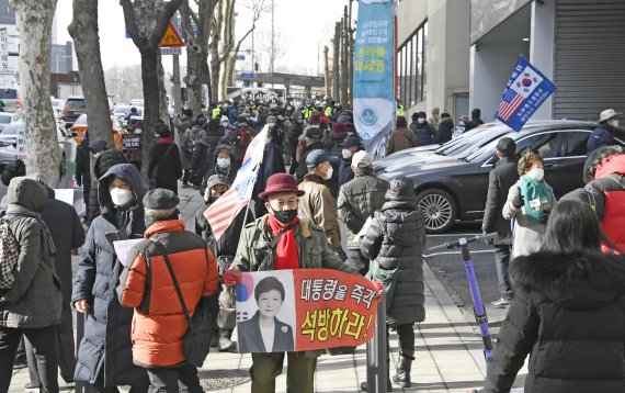 14일 오전 서울 서초구 대법원 앞에서 박근혜 전 대통령 지지자들이 박 전 대통령의 석방을 촉구하며 시위를 하고 있다. 대법원 3부(주심 노태악 대법관)는 이날 직권남용권리행사방해 등 혐의로 기소된 박 전 대통령에게 징역 20년을 선고한 원심을 확정했다. 박 전 대통령은 지난 2017년 4월 기소돼 약 3년9개월간 재판을 받았다. 사진=박범준 기자