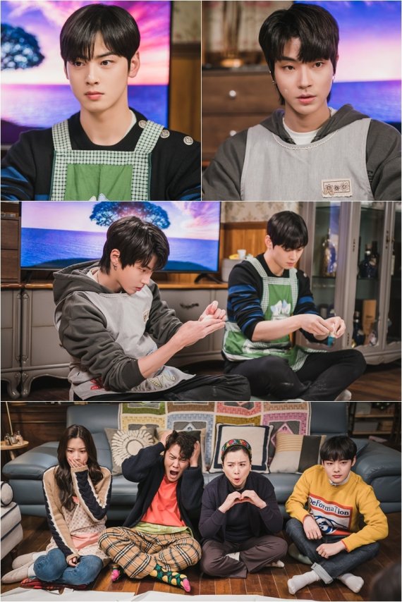 하지만 사뭇 비장한 표정과는 달리 앞치마를 갖춰 입은 두 사람의 귀여운 자태가 웃음을 자아낸다. 이어 수호와 서준은 나란히 앉아 만두를 빚는 모습으로 눈길을 끈다.