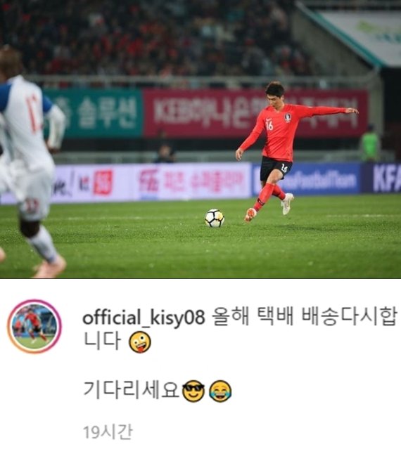 14일 축구선수 기성용은 자신의 SNS에 "올해 택배 배송 다시 합니다. 기다리세요"라는 글과 함께 국가대표팀 유니폼을 입고 경기 중 롱킥을 시도하고 있는 듯한 모습이 담긴 자신의 사진 한 장을 게재했다.