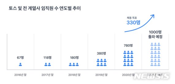 토스 5개사 임직원수는 지난해 말 780명으로 5년 전과 비교하면 12배 가까이 몸집이 커졌다. 특히 지난해 1년 동안 전체 조직 규모가 2배 이상 성장했다는 게 토스 설명이다.