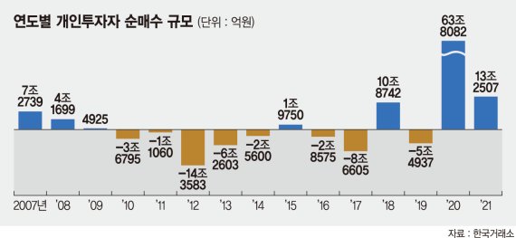 김 연구원은 "개인 자금이 주식시장으로 유입되다 조정을 맞아 유출 전환됐던 지난 2009년, 2011년, 2019년 사례를 보면 공통적으로 코스피 지수가 고점 대비 20% 이상 하락했다"면서 "주가지수가 20% 이상 조정을 보인다면 이번에도 개인 자금이 주식시장에서 이탈할 가능성이 있다"고 주장했다.