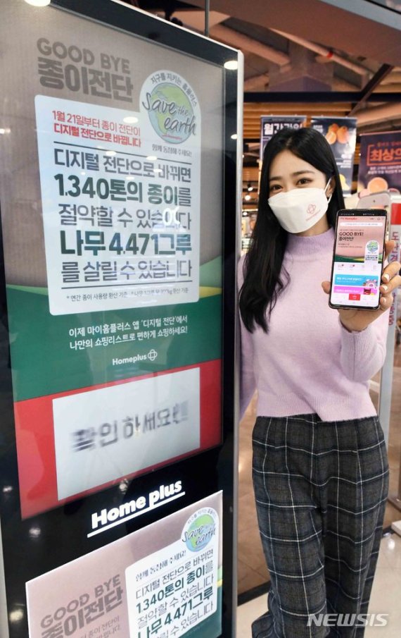 홈플러스는 2018년부터 마이홈플러스를 통해 모바일 영수증을 제공해 종이 줄이기에 앞장섰다. 이번 디지털 전단을 통해서는 연간 1341t분량 종이를 아껴 나무 4471그루(그루당 종이 300㎏) 를 보존할 수 있게 됐다.