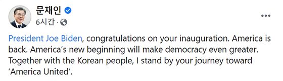 문 대통령은 축전과 별도로 SNS에서도 "바이든 대통령의 취임을 축하한다. 미국이 돌아왔다"면서 "미국의 새로운 시작은 민주주의를 더욱 위대하게 만들 것"이라고 칭송했다.