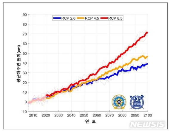 온실가스가 현재와 같은 수준으로 지속 배출된다는 최악의 시나리오에 따르면, 2100년 우리나라 주변 해역의 해수면은 최대 73㎝까지 상승할 것으로 전망됐다. 또 온실가스 감축 정책이 어느 정도 실현되는 경우에는 51㎝, 온실가스 배출이 거의 없어 지구 스스로가 회복하는 경우에는 약 40㎝ 상승하는 결과를 보였다.