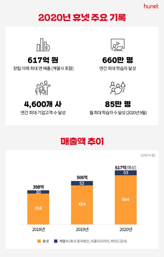 휴넷의 지난해 매출액은 564억원으로 전년 대비 약 24% 성장했다. 휴넷 중국, 쉬플리코리아, 파인드강사 등 계열사를 포함하면 617억원으로 집계됐다.