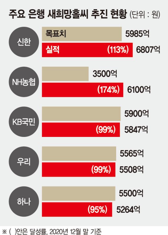 주요 은행들은 새희망홀씨 공급 목표액을 설정한다. 농협은행의 경우 지난해 초 3500억원의 목표를 설정했다. 그후 농협은행은 6100억원(174%)을 달성했다.