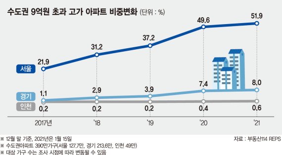 25일 부동산114에 따르면 서울에서 9억원을 초과하는 아파트 비중이 이달 51.9%로 나타났다. 9억원 초과 아파트 비중은 △2017년 21.9% △2018년 31.2% △2019년 37.2% △2020년 49.6%로 최근 4년간 가파른 상승세를 보였다. 9억원 초과 아파트의 비중이 가장 높은 곳은 '서초구'다.