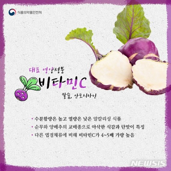 28일 식품의약품안전처에 따르면 콜라비는 수분함량은 높고, 열량은 낮은 알칼리성 식품으로 다이어트 식품으로도 인기가 있다.