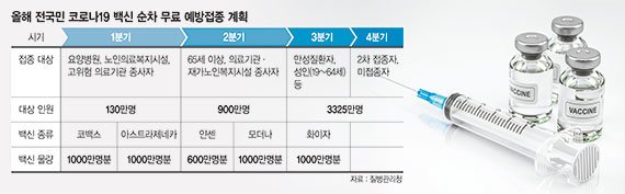 정부는 코백스 퍼실리티 및 아스트라제네카, 얀센, 화이자, 모더나 등 글로벌 제약사와 전 국민 예방접종 분량인 총 5600만명분의 백신을 구매계약했다. 또 백신수급이 불확실한 상황에 대비하기 위해 노바백스 백신 2000만명분 등 추가 백신 확보를 추진 중이다.
