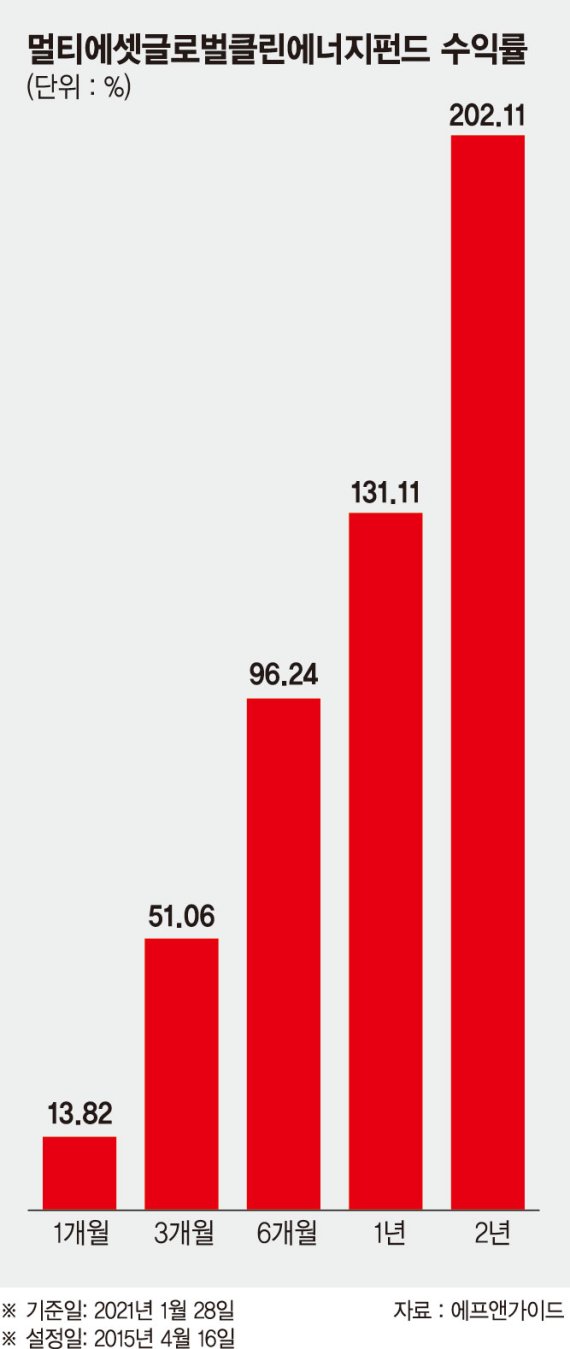 1월 31일 금융정보업체 에프앤가이드에 따르면 멀티에셋글로벌클린에너지펀드의 최근 3개월간 수익률은 51.06%(기준일 1월 28일)에 달한다. 기간을 넓혀 보면 6개월 수익률은 96.24%, 1년간 수익률은 131.11%, 2년간 수익률은 202.11%에 달한다.