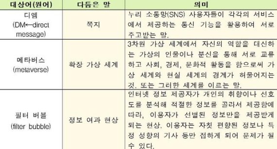 이와 함께 문체부와 국어원은 누리 소통망(SNS) 사용자들이 각각의 서비스에서 제공하는 통신 기능을 활용해 서로 주고받는 말인 디엠(DM) 대신에 쪽지를 권했다.