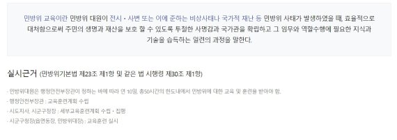 민방위 훈련·교육은 민방위 사태시 국민의 생명과 재산을 보호하기 위해 민방위 대원(만20~40세 남성)과 국민을 대상으로 매년 실시돼 왔다.