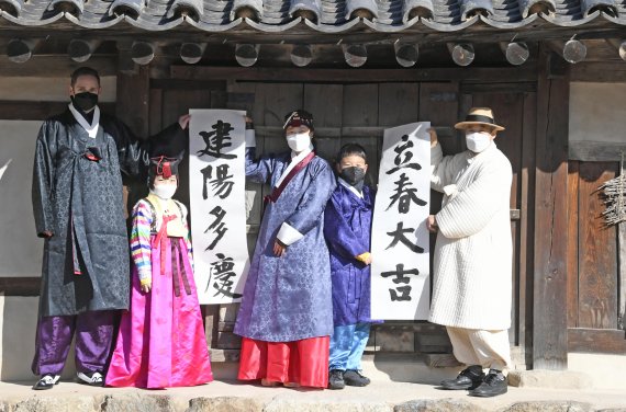 절기상 입춘(立春)인 3일 서울 종로구 국립민속박물관 내 오촌댁에서 열린 입춘 세시행사에서 참석자들이 봄이 시작되니 크게 길하고 경사스러운 일이 많이 생기기를 기원하는 의미의 입춘첩을 대문에 붙이고 있다. 입춘은 24절기 중 첫 번째에 해당하는 절기로 봄의 시작을 알린다.