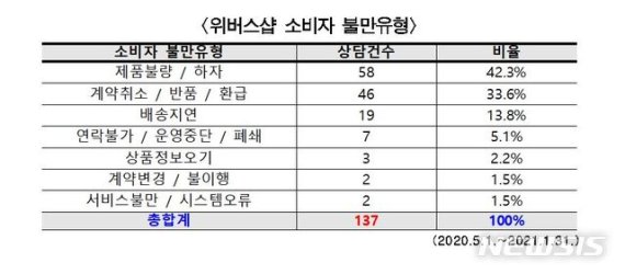 서울시 전자상거래센터에 따르면 지난해 5월~올해 1월25일 위버스샵 관련 소비자피해 상담은 총 137건이다. 유형은 ▲제품불량과 하자(41.7%) ▲반품·환불(34.1%) ▲배송지연(13.6%) 순으로 나타났다.