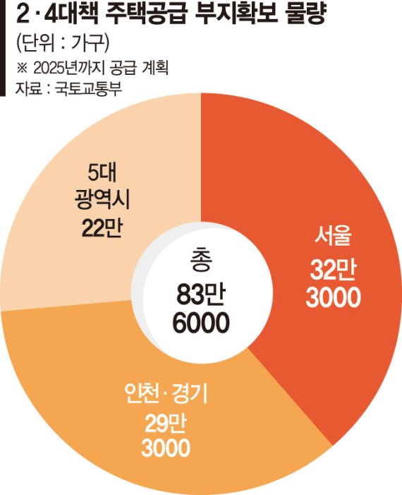 정부는 이번 대책을 통해 2025년까지 서울 32만가구 등 수도권에 61만6000가구, 지방 대도시에 22만가구의 주택을 확보한다. 총 83만6000가구 중 약 57만3000가구는 도심 내 신규 사업을 통해, 26만3000가구는 신규 공공택지 지정 등을 통해 확보한다. 신규 택지는 서울 인근으로 대부분 기존 3기 신도시 인접지역이 될 것으로 예상된다.