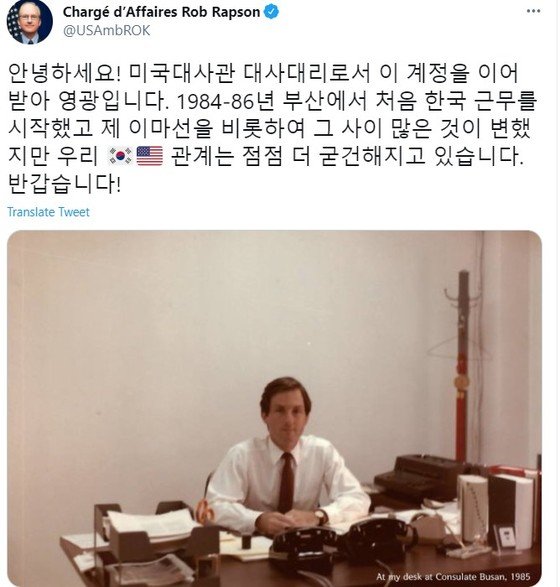 랩슨 대사대리는 이날 소셜네트워크서비스(SNS)에 "미국대사관 대사대리로서 이 계정을 이어 받아 영광"이라면서 "1984년부터 1986년까지 부산에서 처음 한국 근무를 시작했다"며 이같이 적었다.