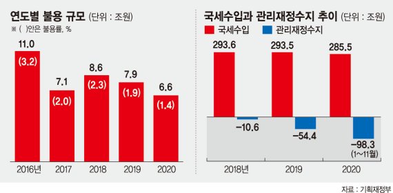 그러나 정부가 적극적으로 예산 집행에 나서면서 예산불용률이 1%대로 떨어졌다. 디지털회계예산시스템이 도입된 2007년 이래 14년만에 역대 최저다. 지난해 불용 규모는 전년보다 1조3000억원 줄어든 6조6000억원으로 집계됐다.