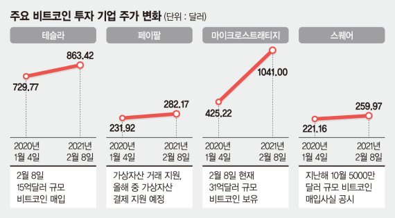 테슬라에 앞서 페이팔, 마이크로스트래티지, 스퀘어 등 내로라하는 정보기술(IT) 공룡들이 가상자산에 투자하거나 관련 사업에 적극적인 모습을 보이고 있다. 비트코인 투자자 사이에서는 비트코인에 투자한 상장사에 투자하는 것이 새로운 투자방법으로 부상하고 있을 정도다.