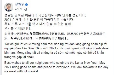문 대통령은 SNS 메시지를 올려 "설날을 맞이한 이웃나라 국민들께도 새해 인사를 전한다"며 "2021년 새해, 건강과 평안이 가득하기를 바란다. 우리 모두 마스크를 벗고 다시 만날 수 있는 날이 오기를 기대한다"고 밝혔다.