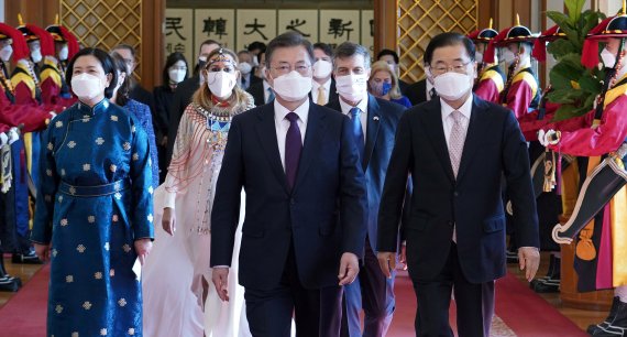 문재인 대통령은 17일 청와대에서 진행된 주한대사 신임장 제정식 후 환담에서 신임 대사들에게 이같이 강조했다고 강민석 청와대 대변인은 서면브리핑을 통해 밝혔다.