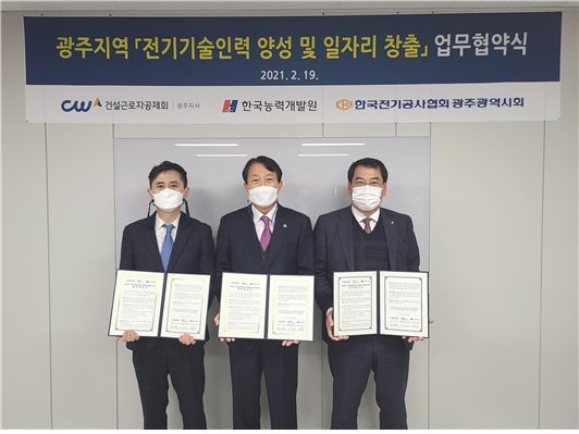건설근로자공제회 광주지사는 19일 한국전기공사협회 광주광역시회(회장 노정규), 재단법인 한국능력개발원(이사장 김윤세)과 '광주지역 전기기술인력 양성 및 일자리 창출을 위한 업무협약'을 체결했다고 밝혔다.