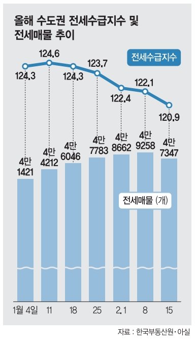 21일 한국부동산원의 주간아파트 전세수급동향에 따르면 지난달 11일 124.6을 기록한 수도권 전세수급지수는 이후 내림세를 거듭하며 지난 15일 기준 120.9까지 떨어졌다. 이 지수는 0에 가까울 수록 공급우위를, 200에 가까울 수록 수요우위를 뜻한다.