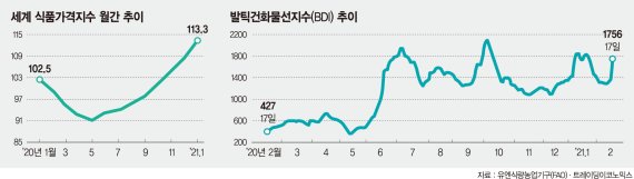 곡물을 실어나르는 벌크선 운임변동을 나타내는 발틱건화물선지수(BDI)는 17일 기준 1756을 기록했다. 해당 지수는 팬데믹이 한창이던 지난해 5월 15일 407을 기록했지만 지난달 1810까지 올라 344% 뛰었다.