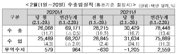 올들어 이달 20일까지 수출과 수입 누계는 각각 784억 달러와 759억 달러로 전년 대비 13.4%(92억8000만 달러↑)와 11.3%(76억8000만 달러↑) 증가했다.
