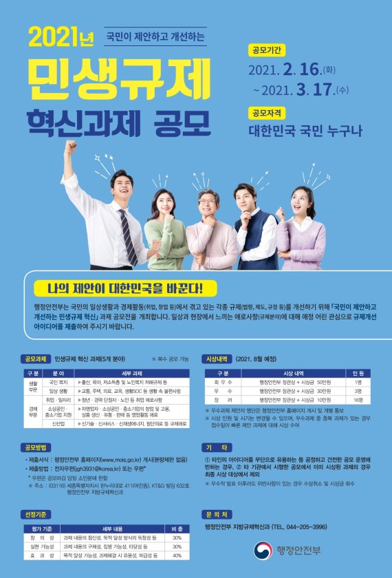 응모된 제안은 국민과 분야별 전문가 등으로 구성된 민생규제 심사단이 심사, 오는 8월 중 우수과제로 선정되면 제안자 20명에게 행정안전부 장관상과 최우수상 50만원, 우수상 30만원, 장려상 10만원을 지급할 계획이다.