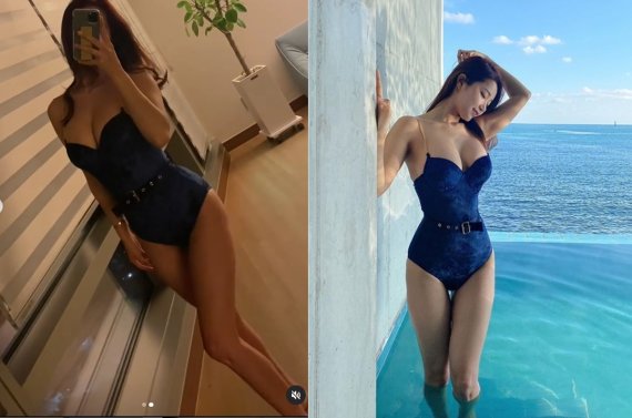 게시물 속 오또맘은 바닷가와 맞닿은 듯한 배경의 한 수영장에서 파란 수영복을 입은채 여러 포즈를 취하고 있다.