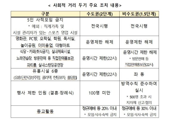 거리두기 2단계인 수도권에서는 100인 이상이 모이는 모임·행사가 금지되며 목욕장업과 관련한 집단감염이 지속 발생함에 따라 수도권의 사우나·찜질 시설의 운영금지는 유지한다.
