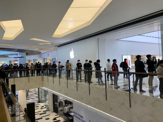 신종 코로나바이러스 감염증(코로나19)과 평일 오전 시간대라 스토어가 들어선 여의도 IFC몰은 한산했지만 애플스토어 앞은 개장을 기다리는 사람들이 줄지어 서 있었다.