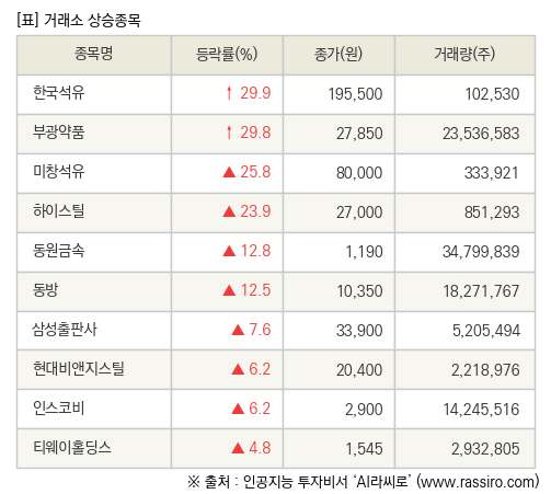 [fnRASSI]장마감, 거래소 상승 종목(한국석유 29.9% ↑)