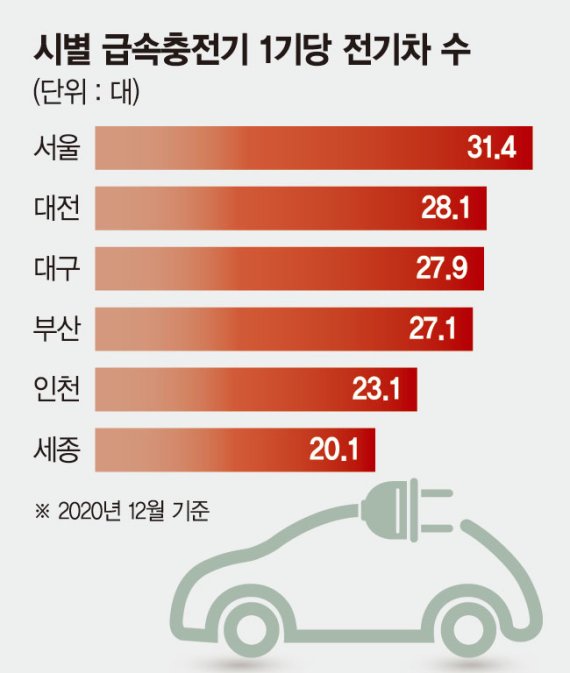 서울에는 지난해 말 기준 총 745기의 급속충전기가 설치돼 있는데 전기차는 2만3393대가 등록돼 1기당 전기차 비율이 31.4대로 전국에서 가장 높다. 경기도의 급속충전기 1기당 전기차 등록대수도 14.9대에 이른다. 전문가들은 원활한 충전을 위해선 전기차 5대당 급속충전기 1기가 필요하다는 입장이다.