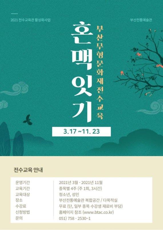(부산=뉴스1) 박채오 기자 = 부산시는 오는 17일부터 11월23일까지 부산전통예술관에서 '무형문화재 혼맥(魂脈)잇기'를 운영한다고 5일 밝혔다.