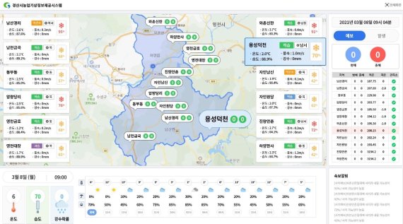 이 시스템은 지역 10개소의 농업기상 관측소에서 실시간으로 기상정보를 수집, 시농업기술센터의 통합정보처리망을 거쳐 농업인들에게 스마트폰 앱 알림과 문자로 전송하는 방식으로 운영된다.
