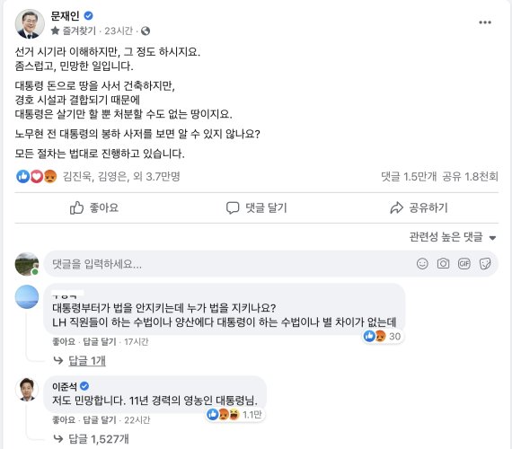 이 전 최고위원은 지난 12일 문 대통령이 사회관계망서비스(SNS)에 야권의 사저 관련 의혹에 대해 "선거 시기라 이해하지만, 그 정도 하시라. 좀스럽고, 민망한 일이다"라며 직접 반박하자, "저도 민망하다. 11년 경력의 영농인 대통령님"이라고 비꼬는 투의 댓글을 달았다.