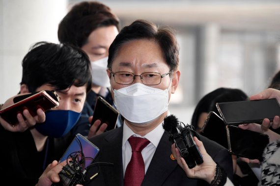 박범계 법무부 장관이 15일 'LH직원들 신도시 투기 의혹' 관련, 검찰 대응을 논의하기 위한 고검장 간담회를 주재했다. 박 장관(가운데)이 이날 회의 참석을 위해 서울 서초구 서울고검에 들어서면서 취재진의 질문에 답하고 있다.
