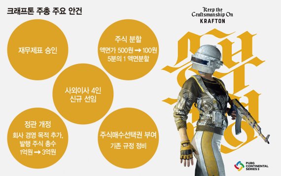 크래프톤은 정관 변경을 통해 현재 액면가 500원인 주식을 5분의 1로 액면분할 해 100원으로 낮출 계획이다.