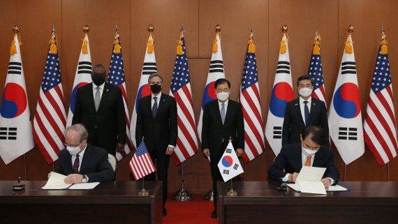 한·미는 이날 오전 서울 외교부 청사에서 양국 외교·국방장관(2+2) 회의 직후 방위비협정 가서명식을 진행했다. 정의용 외교부 장관과 서욱 국방부 장관, 미국 토니 블링컨 국무장관과 로이드 오스틴 국방장관이 참석한 가운데 가서명식이 이뤄졌다.