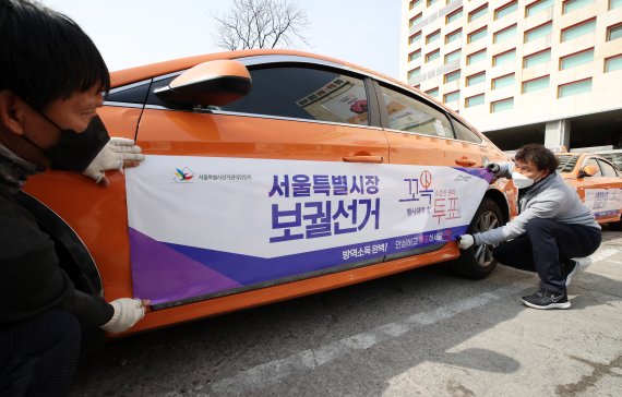 서울시선관위는 이날 보도자료를 통해 "택시래핑 홍보물에는 '서울특별시장 보궐선거'와 '꼬옥 행사해야 할 소중한 권리 투표'라는 문구가 보라색 계열과 붉은색 계열의 색상이 혼합돼 게시됐다"며 이같이 밝혔다.