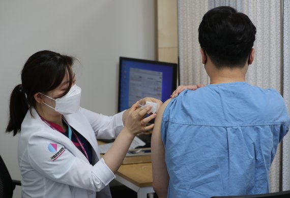 20일 서울 국립중앙의료원(중앙예방접종센터)에서는 코로나19 환자치료병원 종사자들에 대한 화이자 백신 2차 접종을 진행했다. 지난달 27일 1차 접종을 시작한 후 화이자 백신 접종 간격인 3주가 지난 후 2차 접종을 실시한 것이다.