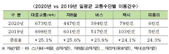 교통 빅데이터 조사결과에 따르면 지난해 한 해 대중교통(버스, 지하철) 총 이용건수는 34억 건으로 2019년 대비 12억 건(25.9%) 감소했다. 대중교통 이용 감소는 코로나19로 인해 사회적 거리두기와 재택근무 등이 실시되면서 시민들의 이동 최소화, 자발적인 거리두기 참여 영향인 것으로 분석된다.