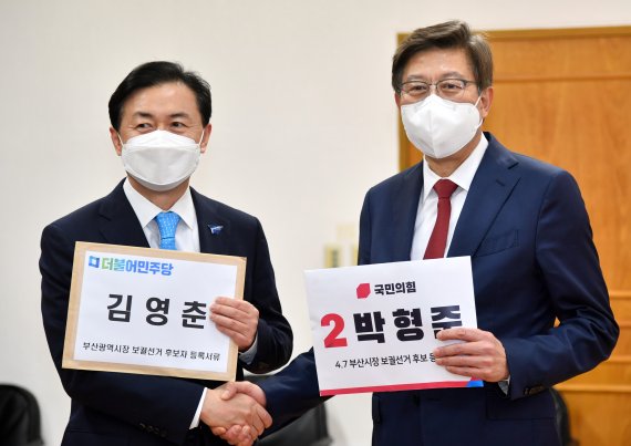 [부산=뉴시스] 하경민 기자 = 부산시장 보궐선거 더불어민주당 김영춘(왼쪽) 후보와 국민의힘 박형준(오른쪽) 후보가 18일 오전 부산 연제구 부산시선거관리위원회에서 후보자등록신청에 앞서 악수하고 있다. 2021.03.18. yulnetphoto@newsis.com [부산=뉴시스] 하경민 기자 = 부산시선거방송토론위원회(위원장 이학수)는 4·7일 부산시장 보궐선거 후보자 토론회를 오는 30일 오후 10시부터 1시간30분 동안 KBS1과 MBC를 통해 동시 중계방송으로 개최한다고 25일 밝혔다.